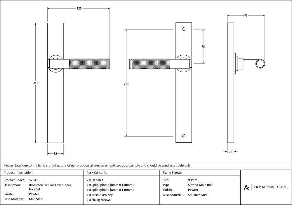 The contemporary Brompton suite features a textured, knurled surface. The industrial styling of the diamond effect creates a modern range of products that can be used throughout your property. Our Brompton lever handle range is forged from mild steel which emphasises the high quality materials and manufacturing techniques used. A perfect design choice to use throughout your property with many matching products available. This handle has a strong double spring incorporated into the stylish boss design to give both functionality & elegance. Lever handle for external doors where multi-point locking is required. Set includes an internal and external lever espag latch handle. Suitable for use with a French door kit in conjunction with a slimline lever espag. lock set and Euro cylinder. Supplied with matching SS bolt through fixings.