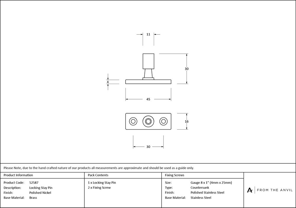 For use with any of our stays when locking is required. Replace one standard stay pin with a locking pin for added security. Sold in singles. Supplied with matching SS wood screws.