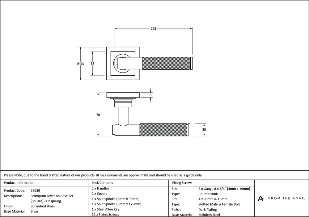 Rose Size : 53 x 53 x 8mm Handle Length : 125mm Fixing Centres : 38mm
