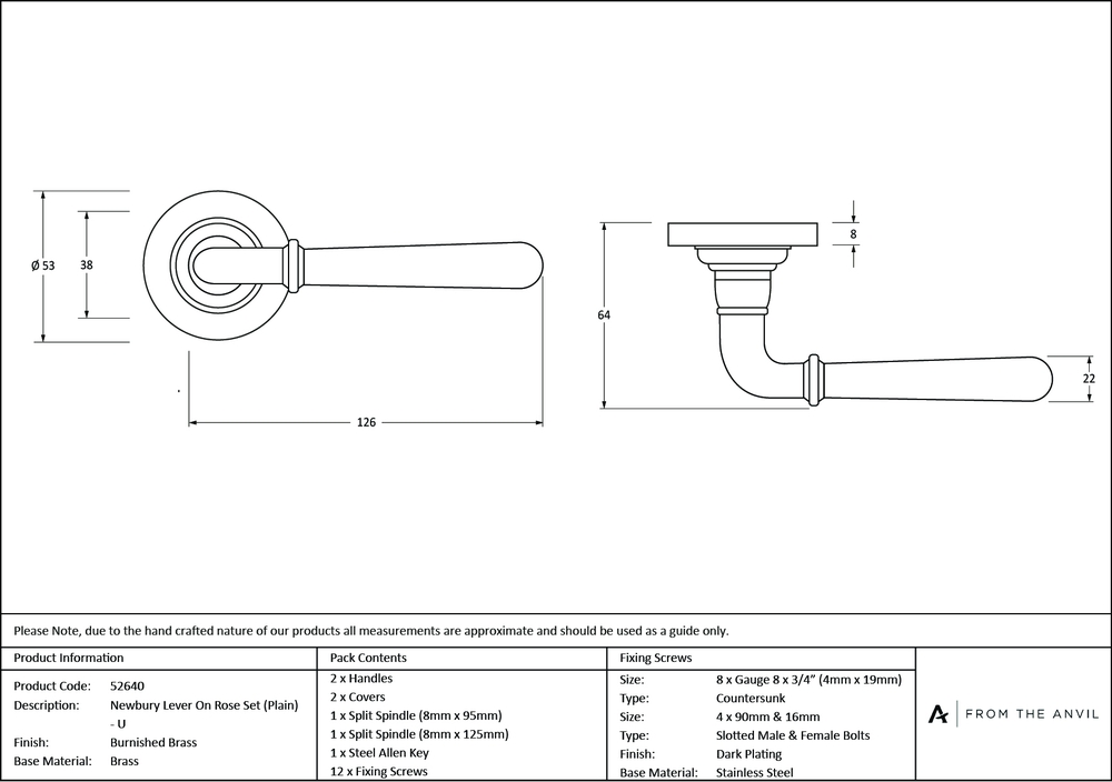 The Newbury range is sleek and elegant, with a slender design that suits a variety of property types. Our weighty Newbury lever handle range is forged from solid brass which emphasises the high quality materials and manufacturing techniques used. A perfect design choice to use throughout your property with many matching products available. This concealed lever handle features a simple Plain rose which adds a contemporary edge to a traditional looking product. The handle is unsprung and is available on a 2 week lead time. Lever handle for internal and external doors where locking is either required or not required. Set includes two concealed lever on rose handles. Suitable for use with a multitude of standard locks, Euro locks, latches, escutcheons, and thumbturns for various purposes. Supplied with matching SS bolt through fixings & SS wood screws.