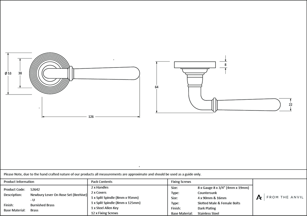 The Newbury range is sleek and elegant, with a slender design that suits a variety of property types. Our weighty Newbury lever handle range is forged from solid brass which emphasises the high quality materials and manufacturing techniques used. A perfect design choice to use throughout your property with many matching products available. This concealed lever handle features a decorative Beehive rose which matches a number of other products in our range and adds a contemporary edge to a traditional looking product. The handle is unsprung and is available on a 2 week lead time. Lever handle for internal and external doors where locking is either required or not required. Set includes two concealed lever on rose handles. Suitable for use with a multitude of standard locks, Euro locks, latches, escutcheons, and thumbturns for various purposes. Supplied with matching SS bolt through fixings & SS wood screws.