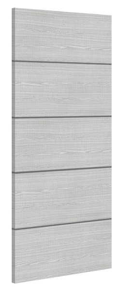Introducing our premium solid core doors, meticulously crafted with hand-picked crown-cut American light grey ash veneer and accented with dark grey horizontal ash inlays for a touch of sophistication. Featuring a closed grain finish prefinished to a luxurious 35% gloss. With solid lippings on all edges. Their versatile design allows for adjustments of up to 3 x all sides, ensuring a perfect fit for any space
