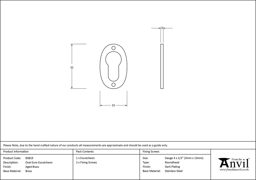 Our vast range of escutcheons are used to decorate key holes, adding the finishing touch to any locking door. Our escutcheons are designed to complement all our mortice knob and lever on rose designs. This Oval escutcheon is used with a Euro profile lock in conjunction with a Euro cylinder. Supplied with matching SS wood screws.