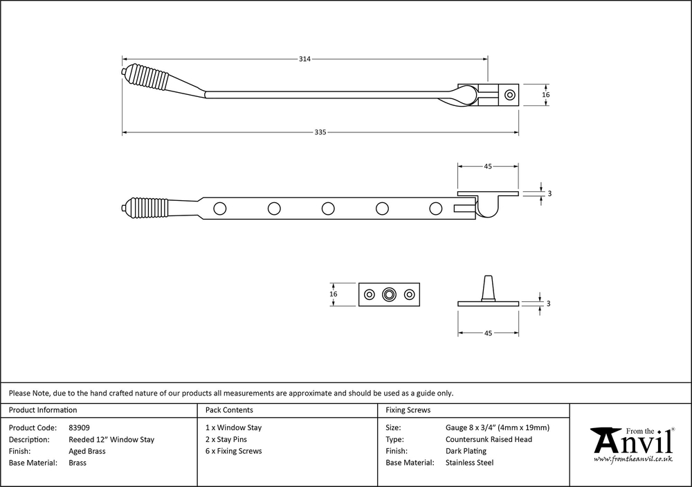Overall Length : 335mm Stay Arm : 314mm Fixing Plate : 45 x 16mm