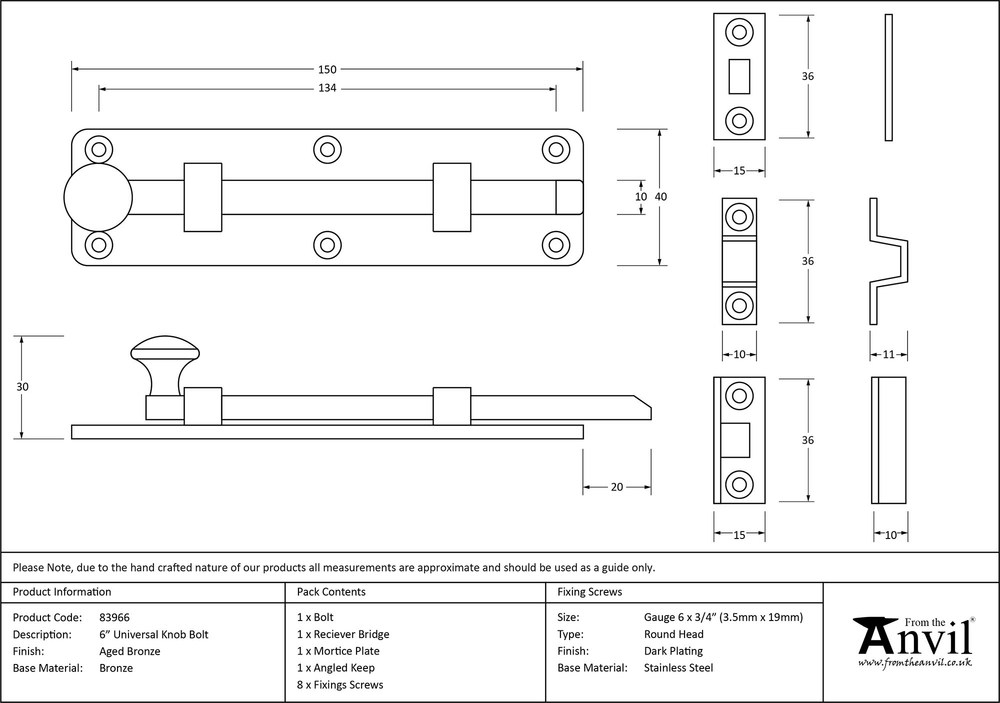 Fixing Plate : 150 x 40 x 4mm Receiver Plate : 40 x 15 x 2mm Receiver Bridge : 43 x 10 x 4mm Height : 16mm Angled Keep : 40 x 15 x 2mm Depth : 10mm Throw : 20mm