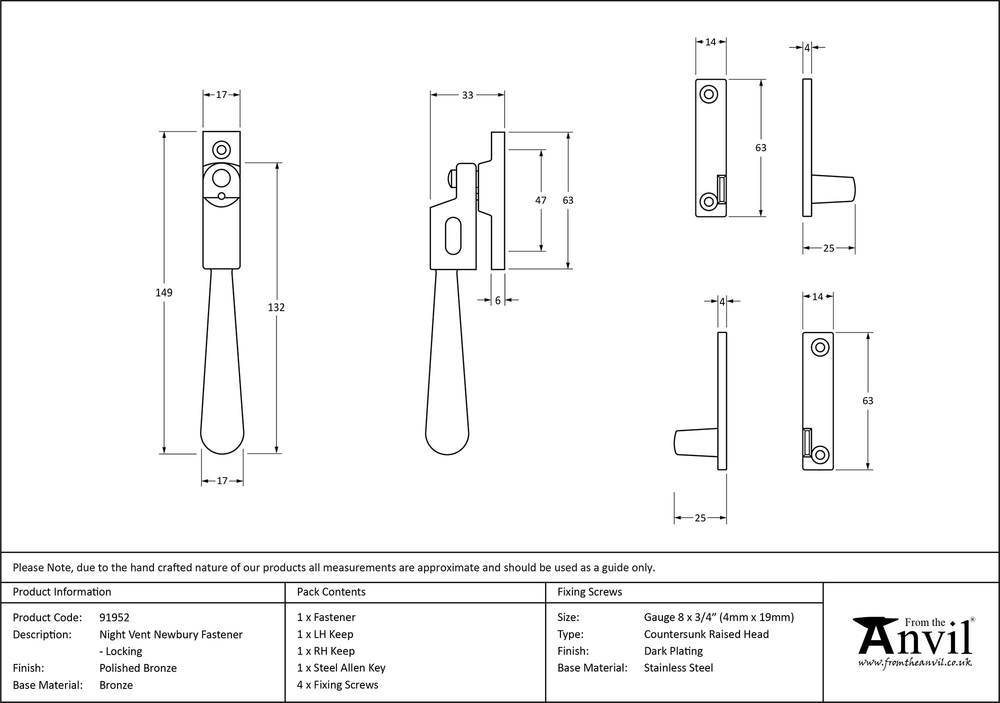 The Newbury range is sleek and elegant, with a slender design that suits a variety of property types. Our weighty range of Newbury window furniture is hand forged from solid bronze to create a product that's as beautiful as it is hardwearing. A perfect design choice to use throughout your property with many matching products available. This handle is night-venting and can be locked in a closed position as well as two open positions to allow some ventilation. The handle is night venting and can be locked in the open position as well as the closed position allowing some ventilation. The locking mechanism operates by way of grub screw. Suitable for use with weather-stripped windows. Supplied with matching SS wood screws.